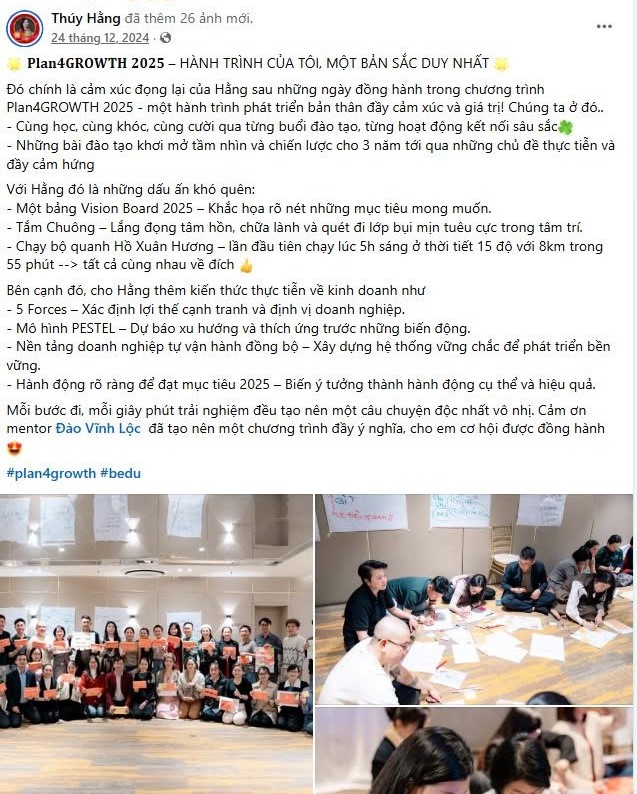 Plan4Growth là chương trình đào tạo 2 ngày vào tháng 12 hằng năm, giúp doanh nghiệp chuyển hóa từ tầm nhìn đến thực thi cho doanh nghiệp của mình. Đến với chương trình, bạn sẽ có được: